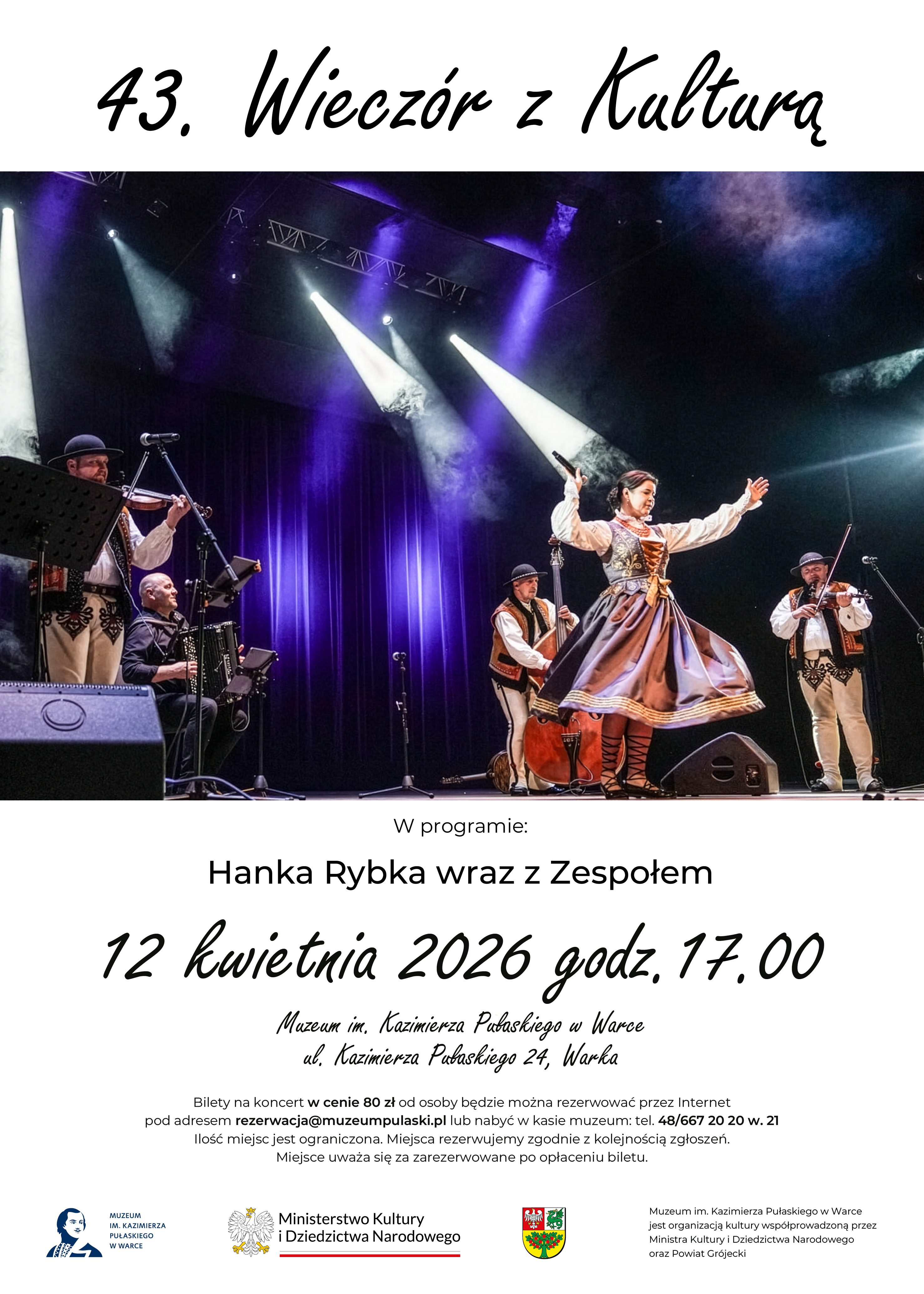 zeum im. Kazimierza Pułaskiego w Warce zaprasza na 43. Wieczór z Kulturą Hanka Rybka z Zespołem - 12 kwietnia godz. 17:00.