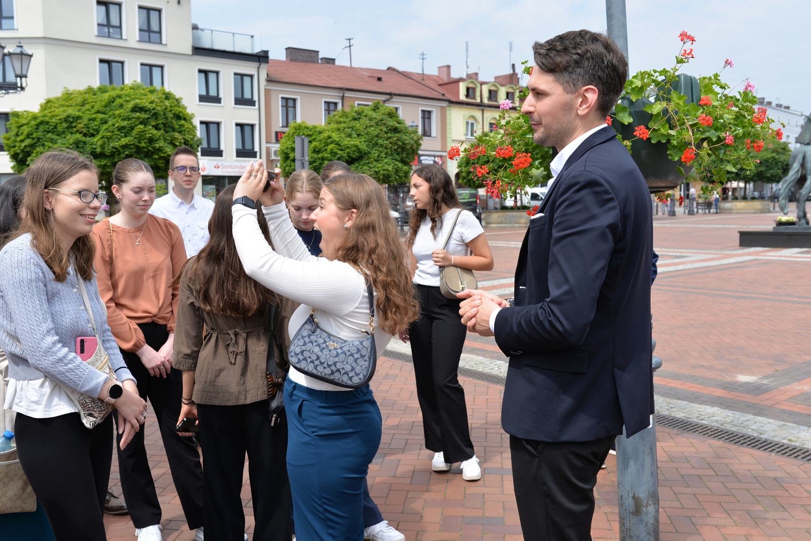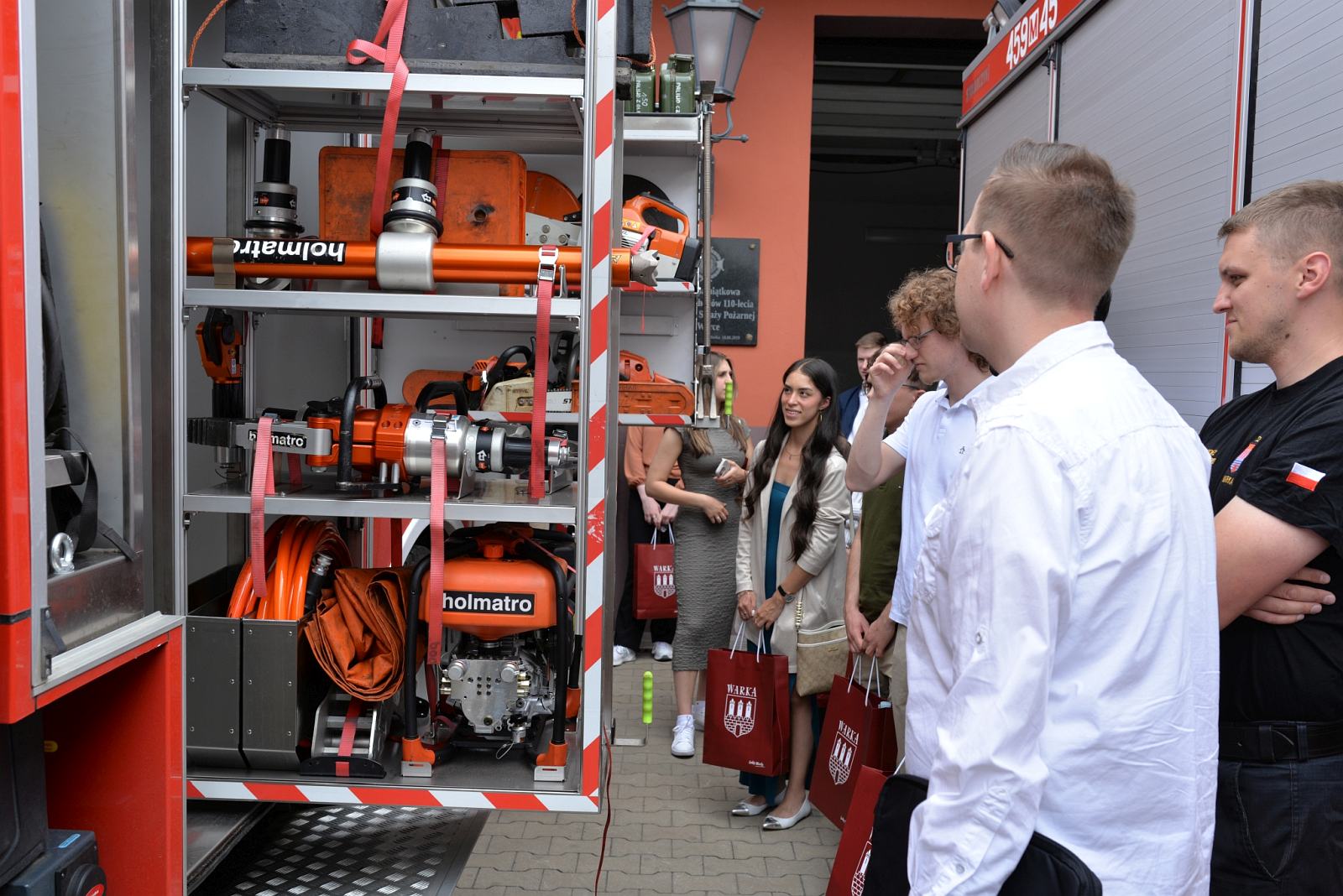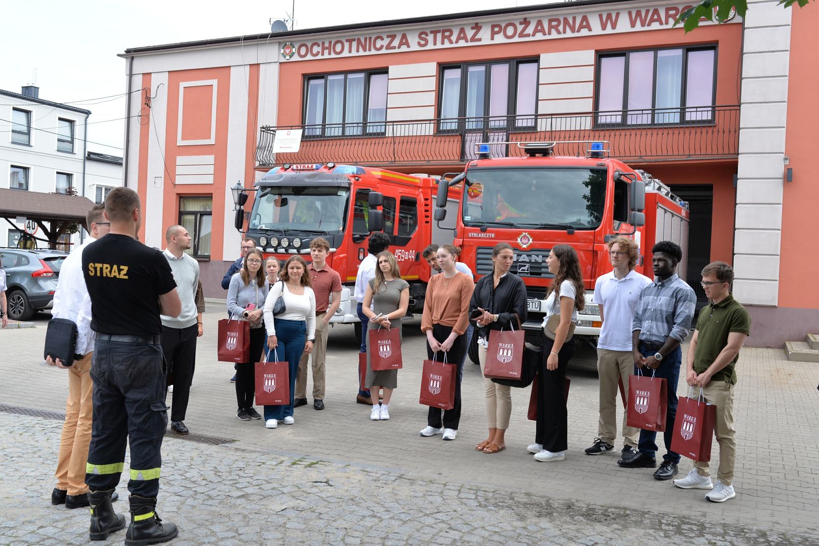 Z Muzeum udaliśmy się do Urzędu Miejskiego, gdzie młodzież spotkała się z Burmistrzem Warki – Tomaszem Rawskim. Była to doskonała okazja do porozmawiania z gospodarzem miasta m.in. o tradycjach sadowniczych regionu. Aby tej tradycji uczynić zadość poczęstowano gości szarlotką z wareckich jabłek. Następnie tłumacz Pana Burmistrza zabrał młodzież przed siedzibę Ochotniczej Straży Pożarnej, gdzie zaprezentowano wareckie wozy strażackie.