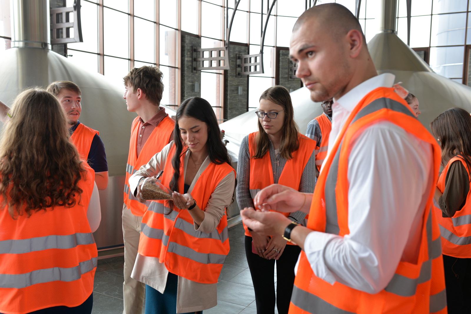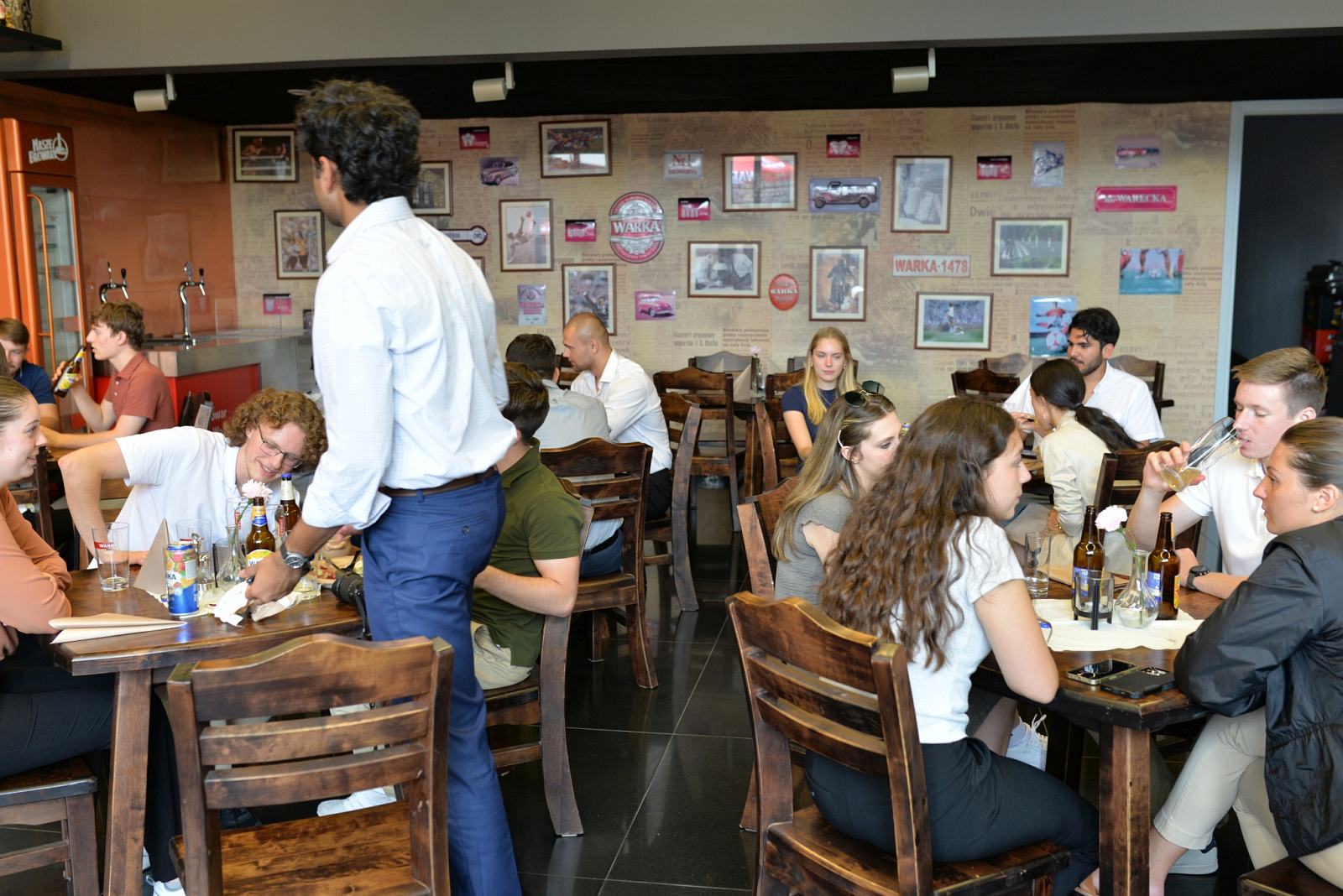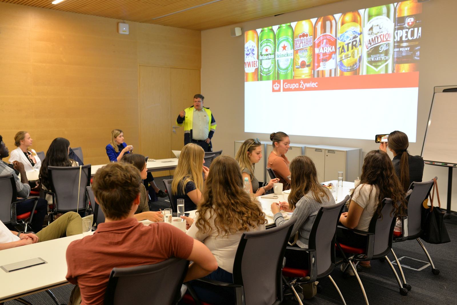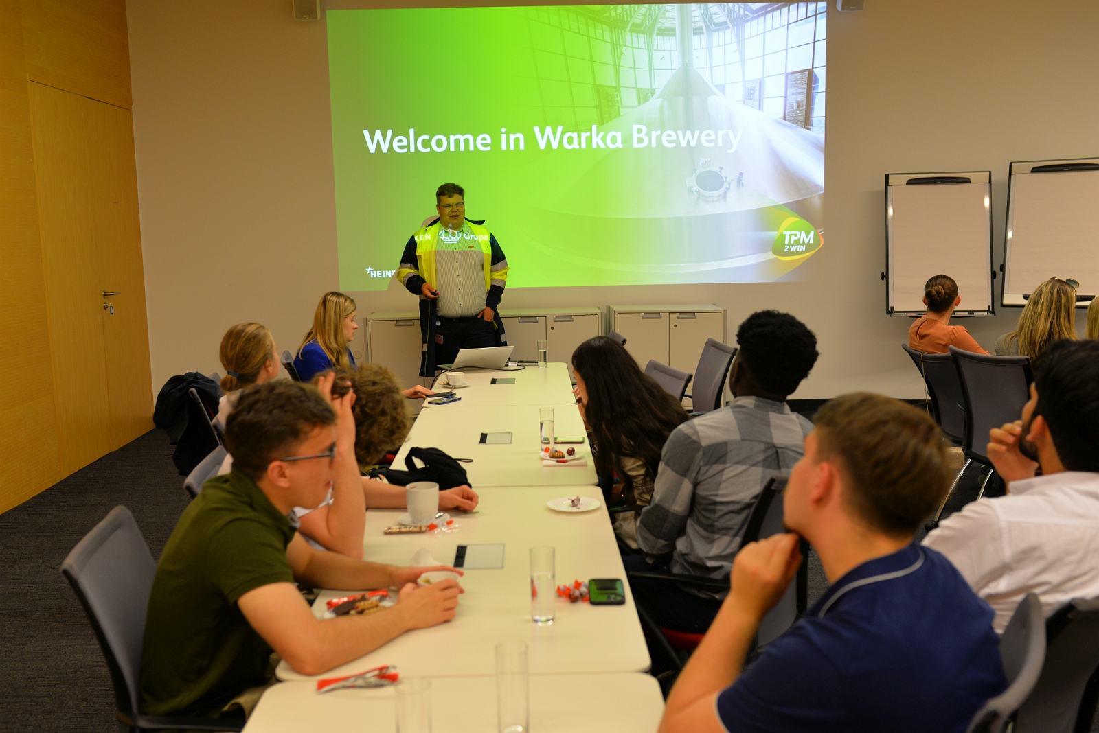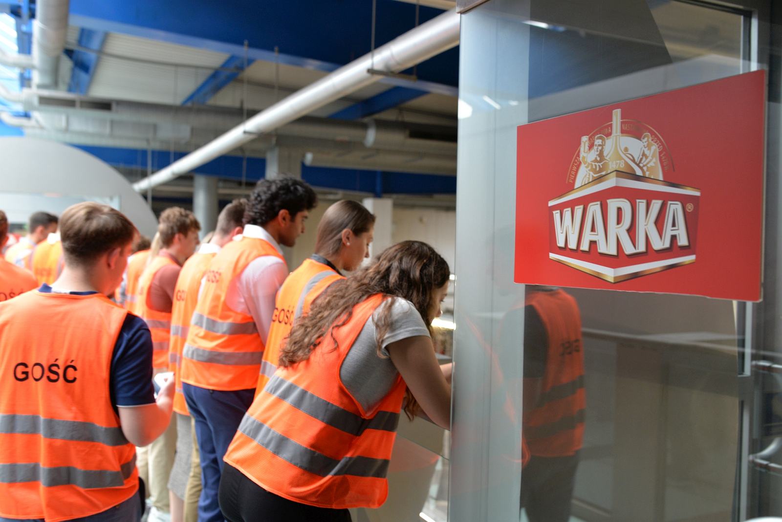 Kolejnym punktem wizyty był Browar Warka. Studentów przywitał Dyrektor Patryk Cieślik, który opowiedział im o specyfice produkcji piwa i osobiście oprowadził po zakładzie – jednym z najnowocześniejszych browarów w Europie. Była więc możliwość zobaczenia m.in. warzelni i linii produkcyjnych. W Centrum Konferencyjnym Browaru odbył się lunch, a po odpoczynku cała grupa udała się ponownie do Muzeum.