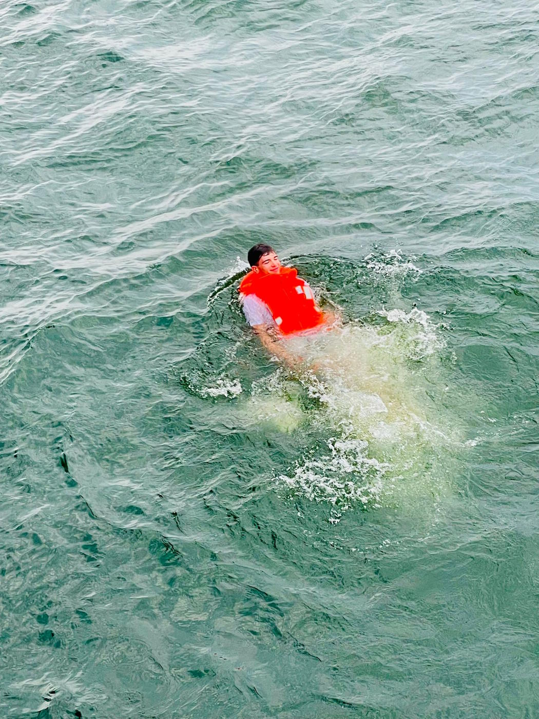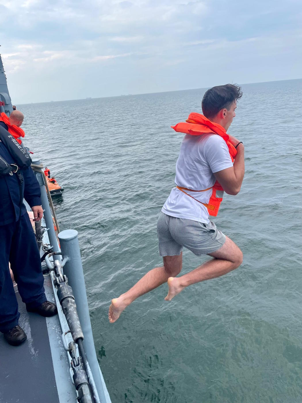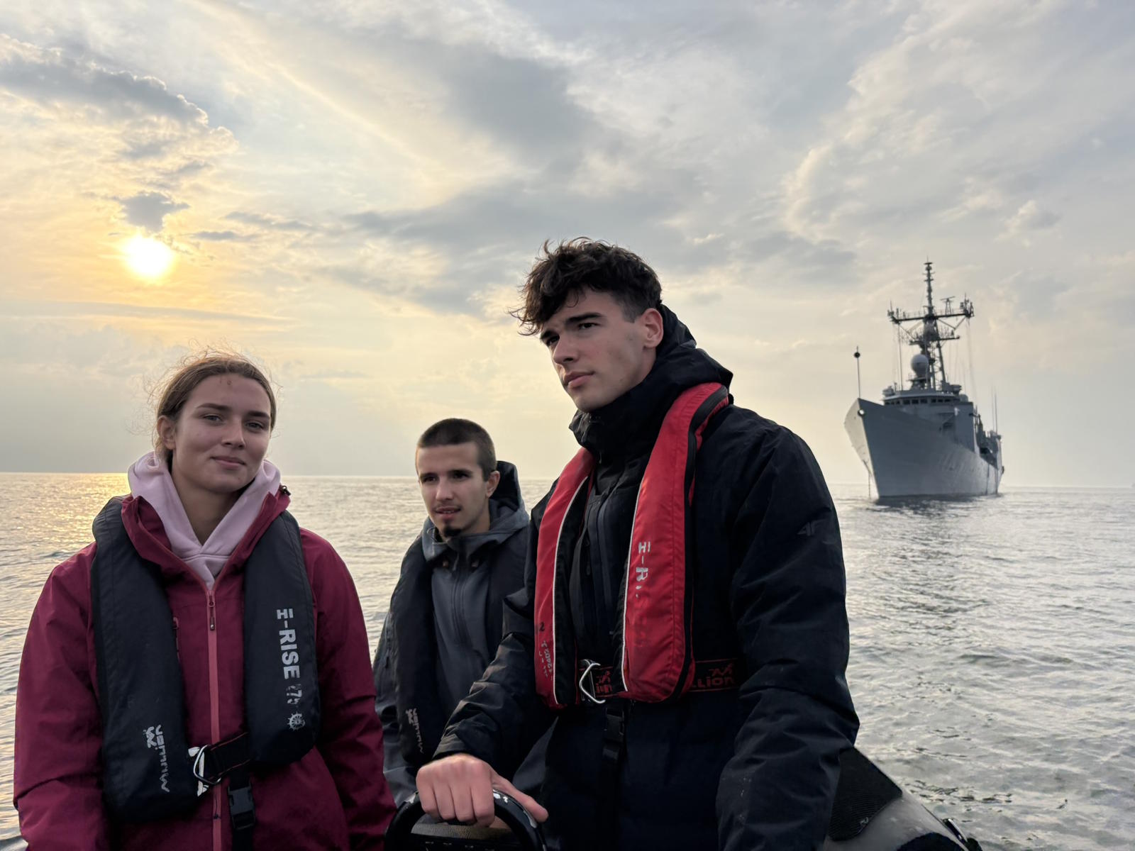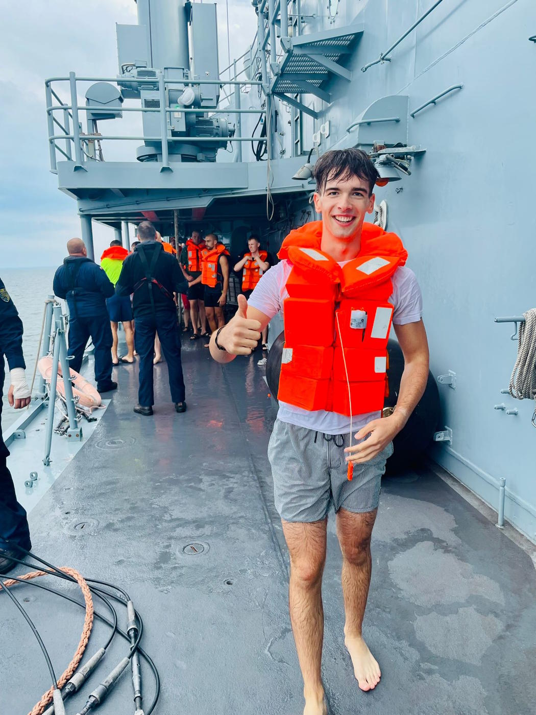 Mieliśmy także niepowtarzalną okazję wziąć udział w ćwiczeniach marynarzy, które odbywają się cyklicznie jako część ich wyszkolenia. Uczestniczyliśmy w symulacji ewakuacji – skakaliśmy do morza i dopływaliśmy do tratwy, a następnie wspinaliśmy się po drabinie na burtę. Adrenalina sięgała wtedy zenitu! Kolejnym zadaniem było wejście do zadymionego pomieszczenia w pełnym stroju strażackim, gdzie w całkowitej ciemności musieliśmy ugasić „pożar” – dzięki temu mogliśmy zrozumieć, jak trudna i wymagająca jest służba na morzu.