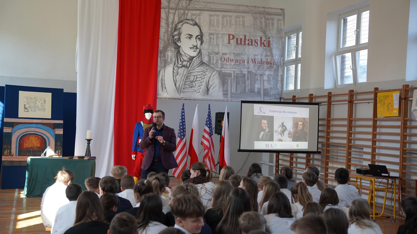 W dalszej części spotkania młodsi uczniowie z ogromnym zainteresowaniem wysłuchali „Bajki o Kaziu Pułaskim” opowiedzianej przez naszą edukatorkę Marzenę Pawłowską, a następnie zmierzyli się z krótkim quizem wiedzy. Starsze klasy uczestniczyły natomiast w prelekcji historyka Karola Kucharskiego przybliżającej fenomen postaci Pułaskiego zarówno w Polsce, jak i w Stanach Zjednoczonych. Uczniowie poznali miejsca pamięci bohatera, instytucje noszące jego imię oraz różne formy jego upamiętnienia w literaturze, malarstwie, muzyce i filmie.